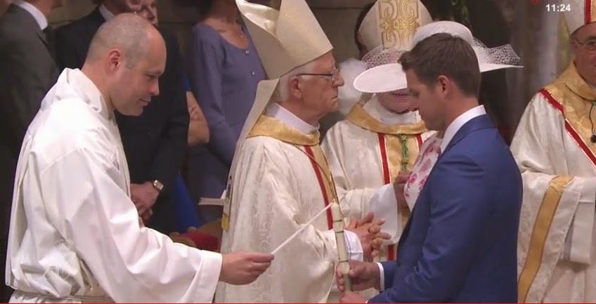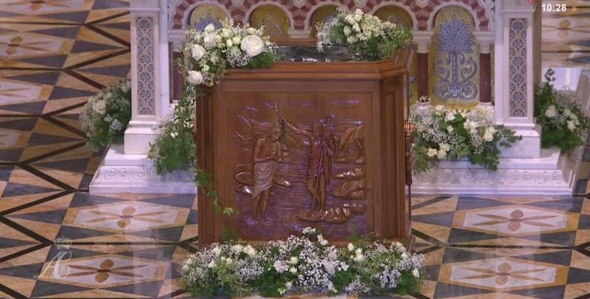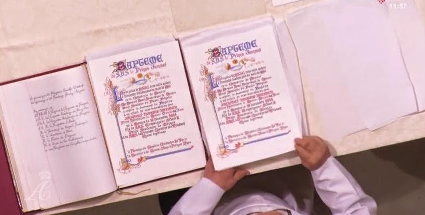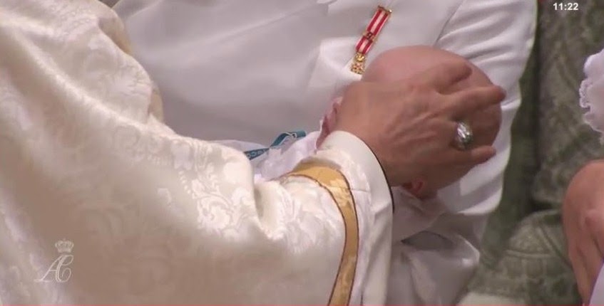 El Arzobispo les preguntó: «¿Cómo vais a llamar a vuestros hijos?», a lo que ellos respondieron: «Jacques y Gabriella». Nuevamente el Arzobispo: «¿Y qué pedís para Jacques y Gabriella de la Iglesia de Dios?», y en respuesta: «El Bautismo». Dicho esto, y tras recordar a padres y padrinos la obligación de educar a los niños en la fe católica, procedieron a la signación (hacer la Señal de la Cruz sobre la frente de cada niño). Acto seguido, entraron en la Catedral y ocuparon sus asientos junto al altar, donde estaba un hermoso baptisterio con una talla representando el Bautizo de Jesús por Juan en el río Jordán.