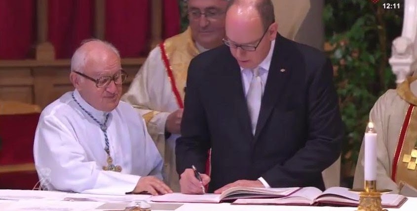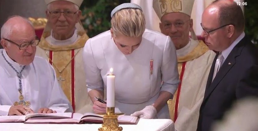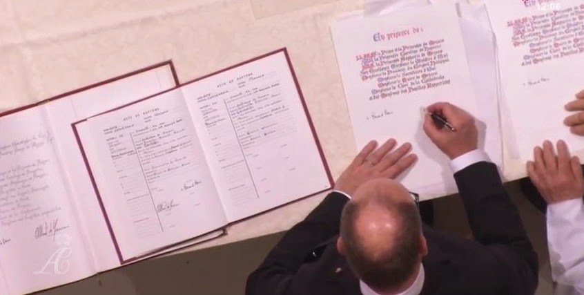Los Príncipes de Mónaco, firmando las actas. La Princesa lleva miniatura como Dama Gran Cruz de la Orden de San Carlos.