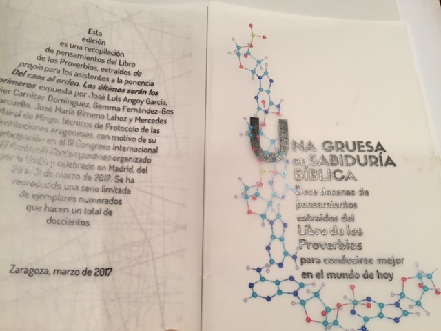 Su conferencia -«Del caos al orden»- se basaba en las lecciones de protocolo que pueden extraerse de la Biblia desde la primera línea. «Al principio creó Dios el cielo y la tierra. La tierra era una soledad caótica», dice esa primera línea y eso es lo hacemos los organizadores de actos y protocoleros. Y para ello utilizamos una serie de técnicas de organización que no son nada modernas: en el Libro de los Libros, si sabemos leer con detenimiento, hay una lista larguísima de recursos que hoy son de plena actualidad y de uso constante.