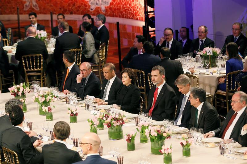 De la mesa en cuestión lo primero fue la presidencia. Las fotos no ayudaban a ver el número de comensales que compartieron mantel con el Rey: en unas parecían ocho y en otras, nueve por cada uno de los dos lados de la mesa. Lo único que estaba claro era que se trataba de una mesa rectangular con presidencia francesa. Al Rey se le ve muy bien: la altura es un dato. Si eran ocho los comensales aquella mesa estaba mal. Y podía parecer que presidía la vicepresidenta.