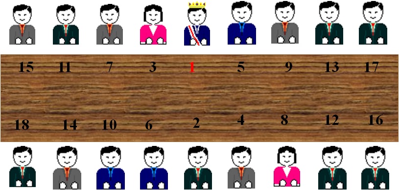 El tipo de mesa y de presidencia son fundamentales para ordenar los puestos de mesa. La mesa rectangular tiene las cabeceras planas y si la presidencia es francesa ningún comensal se sentará en ellas. La presidencia estará en el centro de la mesa. Para marcar claramente qué puesto es el central, el número de comensales por cada lado de la mesa tiene que ser impar. A partir de ese primer puesto ordenaremos los siguientes. La segunda presidencia, frente a la primera. Y luego, los dos puestos a la derecha de ambas; para continuar con los dos puestos a la izquierda de cada una de ellas (sistema cartesiano) o bien, derecha primero e izquierda, después de la primera presidencia y consecuentemente, lo mismo de la segunda presidencia (sistema del reloj) hasta acabar con los puestos de la mesa.