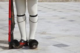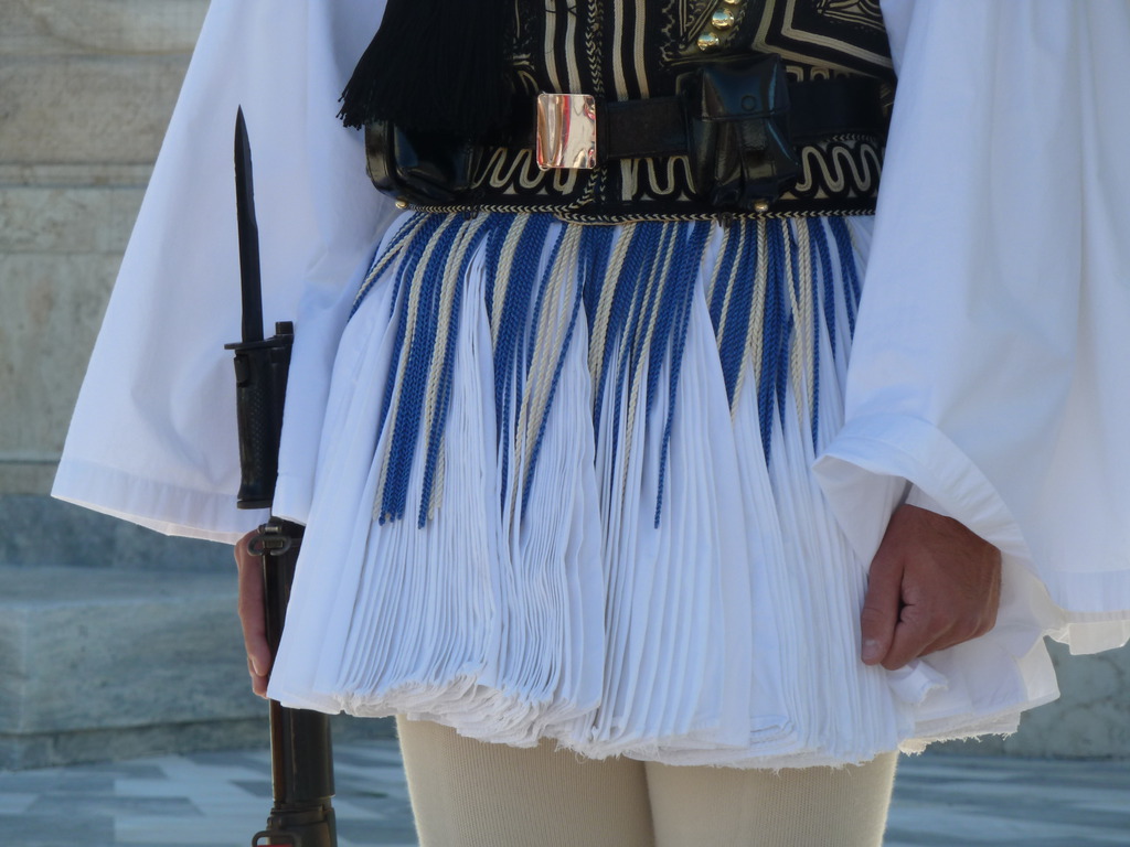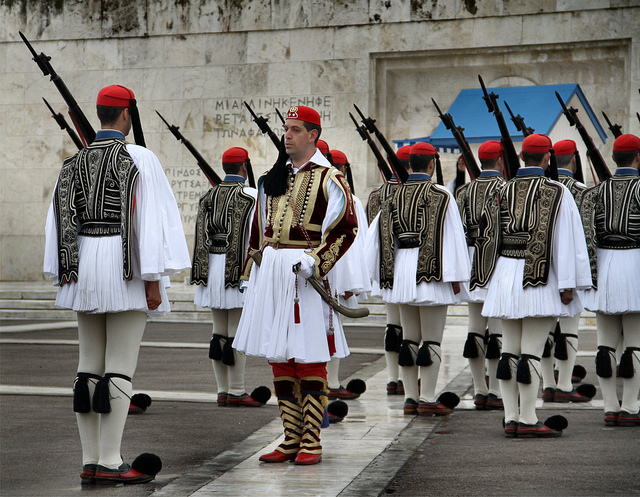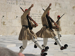 Miramos, pero a veces no vemos, a una figura que acompaña casi todas las imágenes que a diario emiten las televisiones de la Plaza de Sintagma y del edificio Vouli que alberga el Parlamento de Grecia en Atenas. Son los evzones: los miembros de la Guardia Presidencial (Proedriki Froura) que patrulla ante la Tumba del Soldado Desconocido.