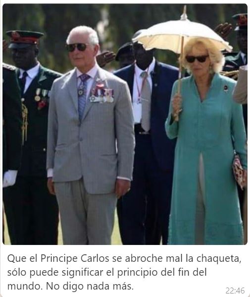 Queda claro así, que la tercera entrada más vista de la semana ha sido la del pasado resumen del la docena de lunes: es lo habitual. De entre los post publicados anteriormente nos ha hecho mucha gracias recuperar una sonrisa de enero de 2019: la de la chaqueta mal abrochada del príncipe Carlos de Gran Bretaña. Creemos que se debe a que volvió a circular: esta vez por Whatsapp. ¡A alguno le debió de parecer perfecta para ilustrar la que nos está cayendo!