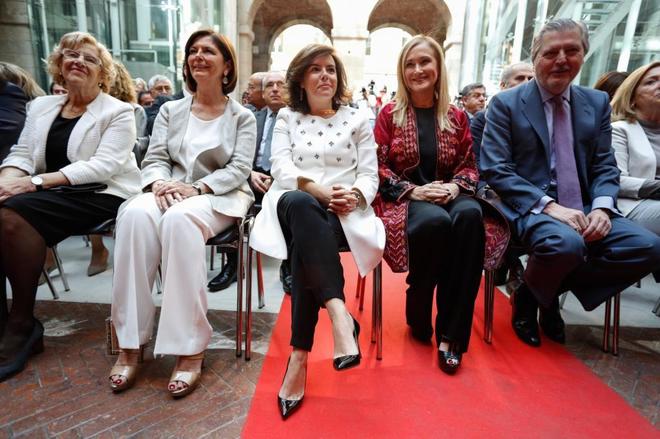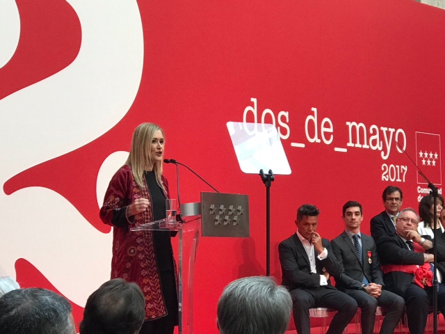 En tarima forrada de color rojo, que es el de la Comunidad. En su lado derecho no faltaron las banderas: la española y la de la Comunidad Autónoma de Madrid. En el izquierdo, asientos para los premiados: en dos filas y ordenados por la categoría de la condecoración. Primero las Medallas de Oro, las Grandes Cruces, y las medallas de Plata, después las encomiendas y al final las Cruces. En dos filas porque quince sillas no caben en el escenario. Al menos, no caben de forma que el movimiento de entrega sea lucido tanto para la Presidenta Cifuentes que las entregaba, como para los condecorados.