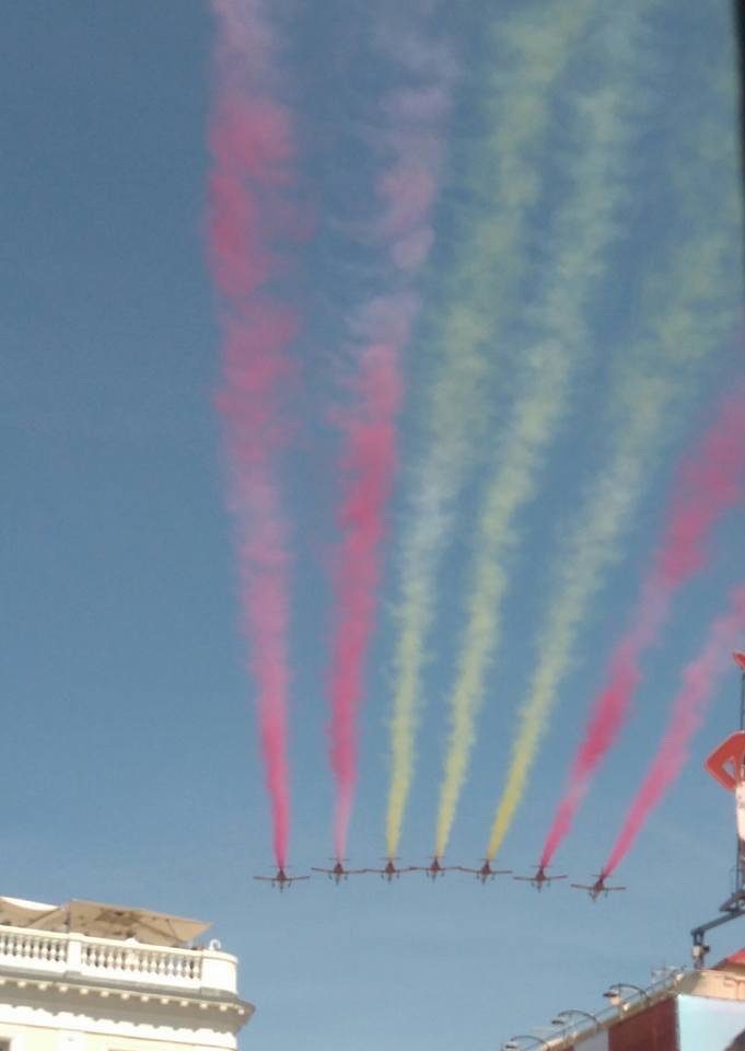 Después de la rendición de honores reglamentarios, revista a la fuerza y del acto de homenaje a los que dieron su vida por España y con su último toque, la Patrulla Águila hizo una espectacular pasada por encima de la Puerta del Sol.