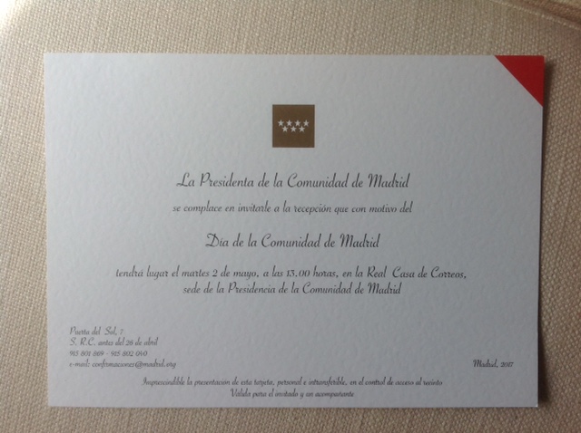 Fue el clásico tarjetón de cartulina que contiene toda la información que requiere el invitado para llegar con bien al evento: el logotipo de la institución anfitriona, el cargo que invita al acto, el tipo de acto al que se invita, el sitio y la hora de la celebración. Además de informar del lugar exacto en el callejero, el teléfono y un correo electrónico para confirmar la asistencia o para preguntar cualquier cosa si es necesario y los avisos importantes, si es que lo hay. En este caso, la hora a la que había que estar dentro del edificio y el aviso de que la invitación era imprescindible para acceder.