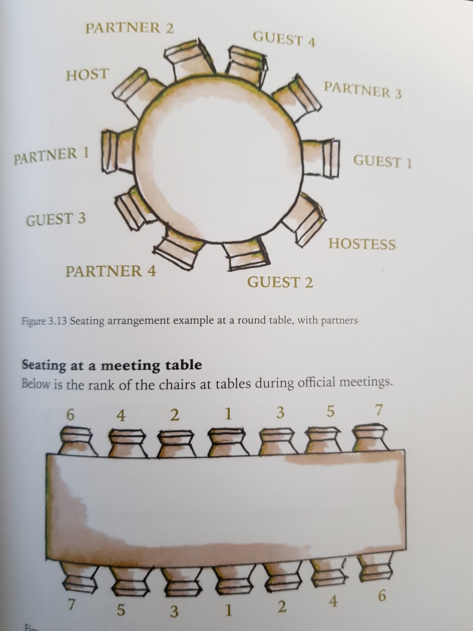 El capítulo tres nos va a sonar un poco más. Trata de la práctica protocolaria y de la forma de incorporar el protocolo y sus técnicas en reuniones y actos de muy alto nivel. Es decir, y por ejemplo, sistemas de ordenación de comensales en mesas redondas; precedencias y rangos; protocolización de auditorios … actos hechos a medida.