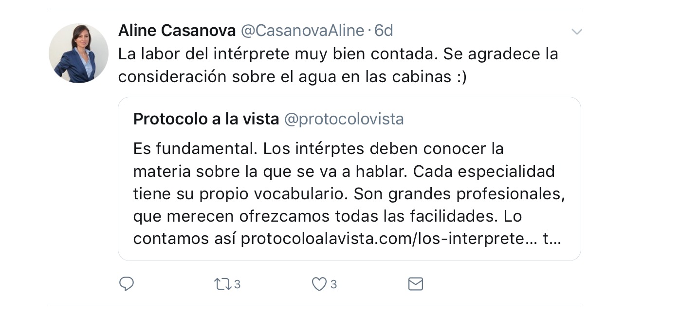 Además de entrar en el hilo de la conversación, de dar nuestra opinión y de intercambiar pareceres con otros blogueros y protocoleros, retuiteamos un post sobre los intérpretes que publicamos porque nos pareció que podía contribuir a explicar la labor de estos profesionales. Somos muy conscientes de que su trabajo es absolutamente imprescindible y que las condiciones de su trabajo y las exigencias que conlleva están más que justificadas. Son la base del éxito de muchos actos. Y así lo habíamos contado en dicha entrada. La curiosidad de muchas personas ha hecho que las visitas al post hayan subido de una manera brutal. Nos alegra mucho, muchísimo, el interés creado. Pero especialmente, nos alegramos un montón de haber podido participar en una conversación tan interesante y se lo agradecemos a todos los lectores que se han acercado. Es por tanto el #TOP1concorona de esta semana.