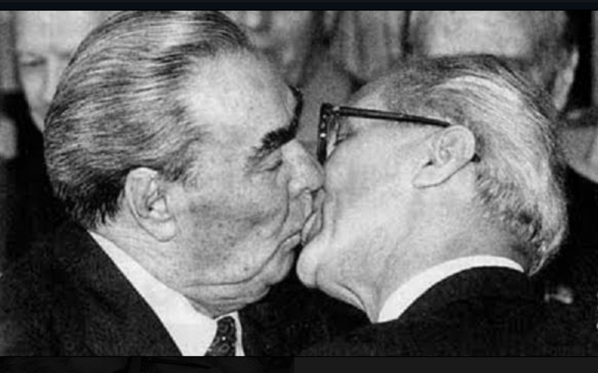 … Leonidas Brezhnev (URSS) y Erich Honecker (RDA) dándose un bico fraternal. Del fotógrafo Regis Bossu en el año 1979… ¡de cuando la Guerra Fría!