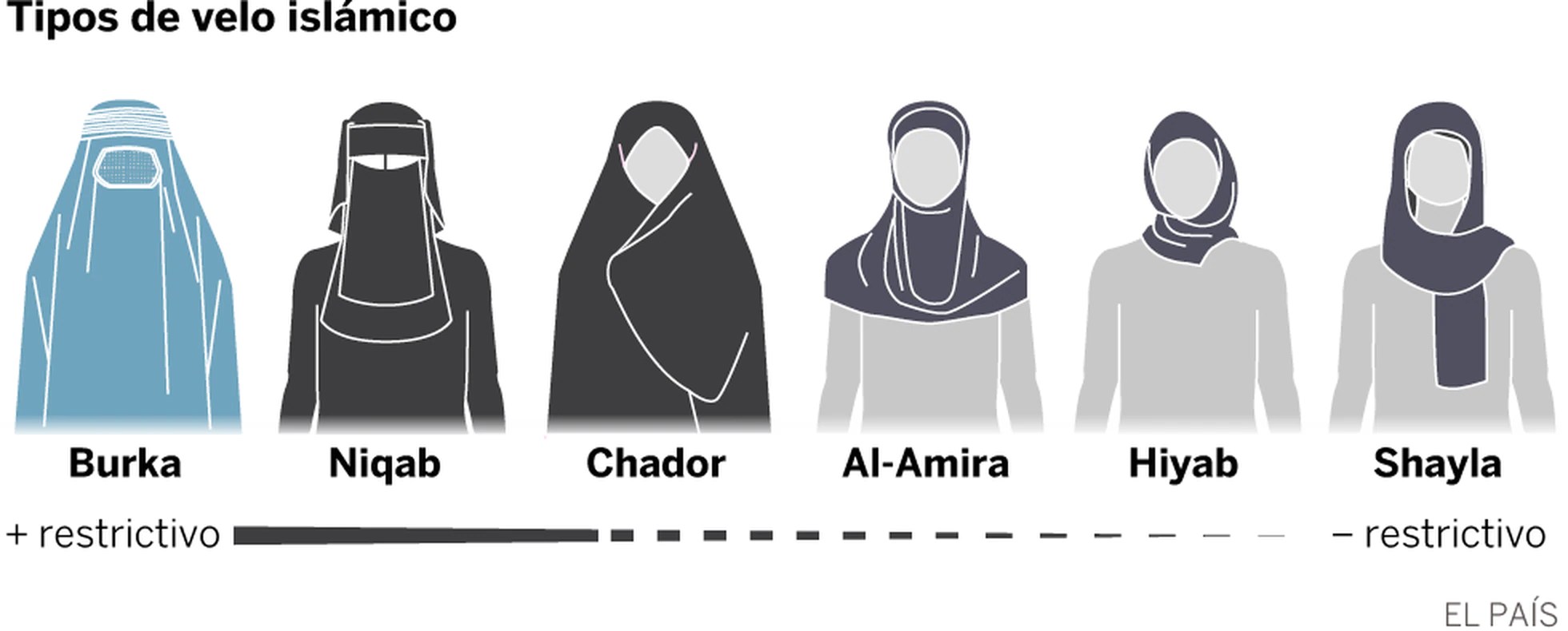 (Fotos: malla de un burka; burkas de diferentes colores; azul; mujeres con niqab; niqab; hijab; shayla; al amira; khimar; chador blanco; chador estampado; croquis de los diferentes tipos de velos)