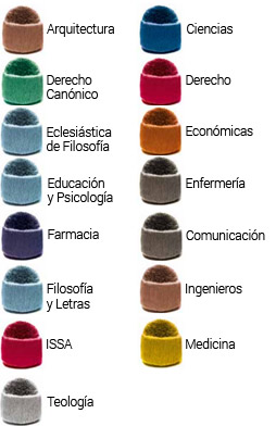 El birrete -ese que tiran al aire los graduados o licenciados que hemos mencionado antes- es hexagonal, de raso negro y sin flecos, aunque sí lleva una borla de seda del color de la Facultad.
