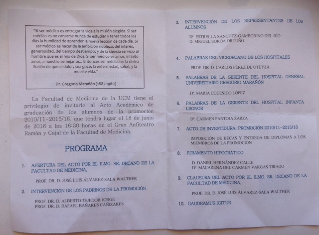 Es lo que hemos copiado, como otras muchas cosas, por su vistosidad y el acto ha acabado por imponerse en muchas universidades, especialmente en las privadas. Pero hay ceremonias de fin de carrera: nada más clásico que las de las facultades clásicas. Para el post de hoy nos va a servir de guía la celebrada este sábado pasado en la Facultad de Medicina de la Universidad Complutense de Madrid.